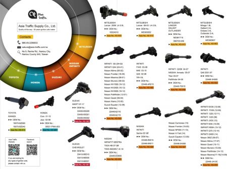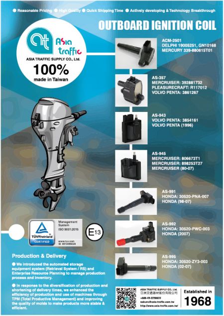 موجودة في تايوان منذ عام 1968 ، Asia Traffic Supply Co., Ltd. كانت الشركة الرائدة في صناعة ملف الاشتعال في قطع غيار السيارات والدراجات النارية. منتجاتهم الرئيسية تشمل ملف الاشتعال هوندا CR-V 30520-PNA-007 ، وملفات الاشتعال ، وملفات الاشتعال للدراجات النارية ، والأبواق الكهربائية ، ووحدات الاشتعال ، وغطاء شمعة الإشعال ، إلخ.